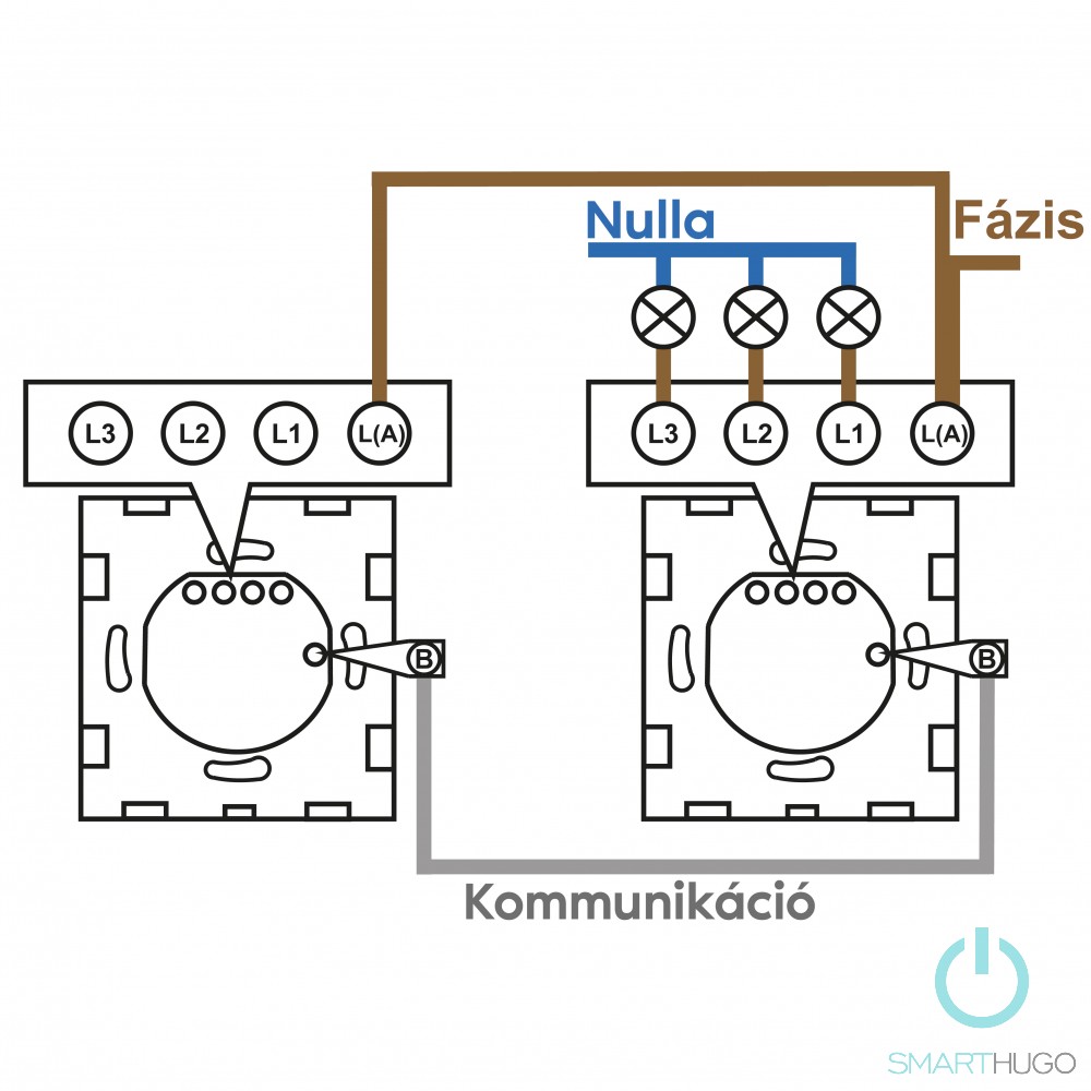 Bekötés: "L" - Fázis vezeték; "B" - Kommunikációs vezeték; "L1" - Lámpaszál- Kapcsolt fázis (csak a főkapcsoló esetén)